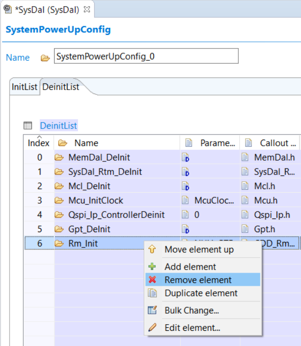 導航到SysDal插件配置,選擇SysDalBswConfig ->PowerUp ->DeinList 。在列表中,刪除項目Rm_Init。