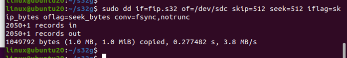 $ dd if=fip.s32 of=/dev/sdb skip=512 seek=512 iflag=skip_bytes oflag=seek_bytes conv=fsync,notrunc