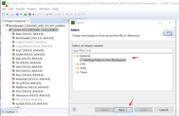 點擊 tresos_gui.exe 打開軟體,點擊 file -> Import… -> 選擇 General -> 點擊 Existing Projects into Workspace -> 點擊 Next。
