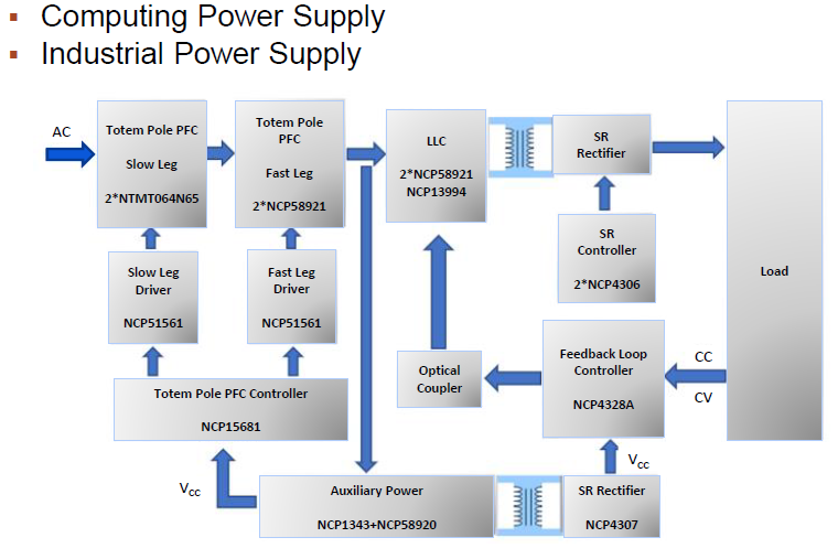 本方案使用NCP1681 Totem pole PFC架構 + NCP13994 LLC架構 + NCP4306同步整流電源應用,次級採用NCL38046可以支援Analog與PWM調整輸出功率,輔助電源採用NCP1343-CCM/QR控制。