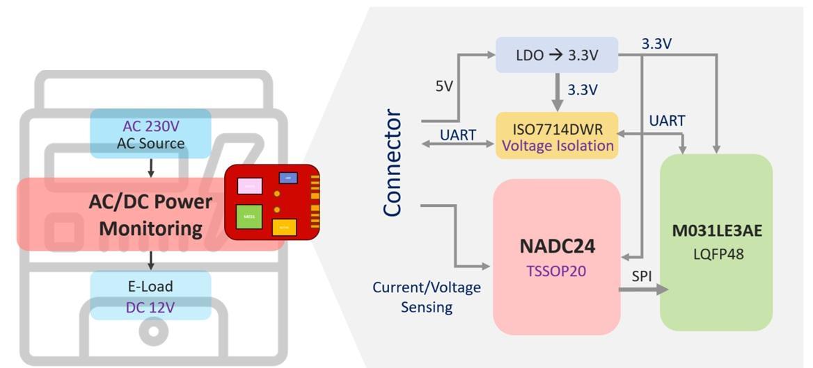 NADC24 是由新唐科技開發的一款高精度 24 位元 Delta-Sigma 類比數位轉換器(ADC),專為低噪聲、高解析度的類比信號轉換而優化。當與基於 Cortex-M0 的 M031 微控制器搭配使用時,它能夠為單相電源(PSU)提供精準且經濟高效的功率測量解決方案。該系統可即時監測電壓、電流和功率,同時提供使用者友善的介面,用於配置和校準。其緊湊且整合的設計使其適用於能源監測、工業控制和儀器儀表應用。
