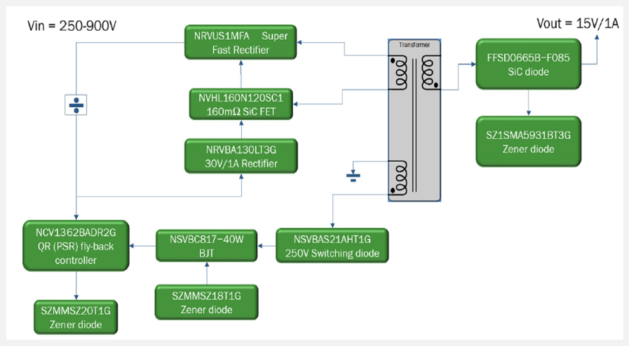 NCV1362控制器具備優異的驅動能力,可直接以12V操作碳化矽MOSFET,無需額外驅動器,簡化佈局並減少元件數量。反激式變壓器提供4 kV隔離,並針對RCD緩衝器損耗進行優化設計,有效抑制高壓輸入下的汲極電壓過衝,並為碳化矽MOSFET提供100V的安全裕度。