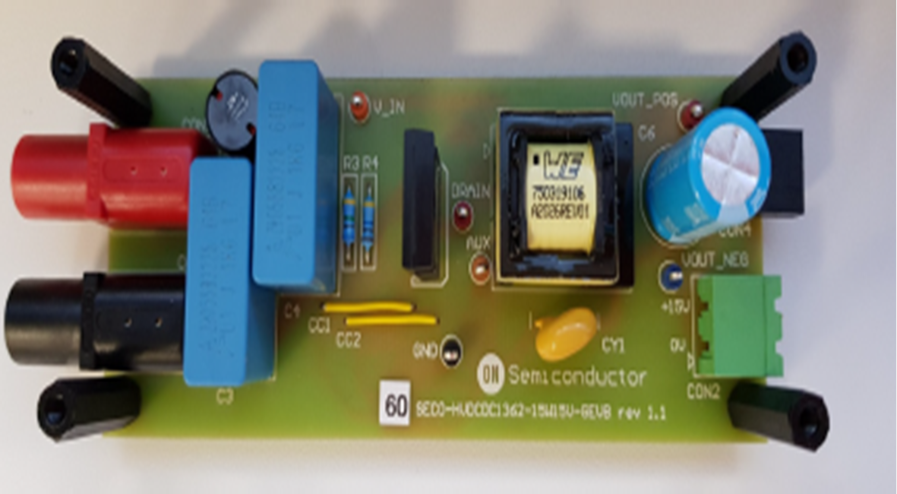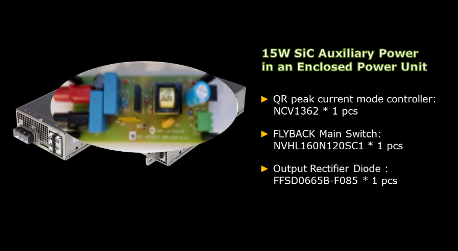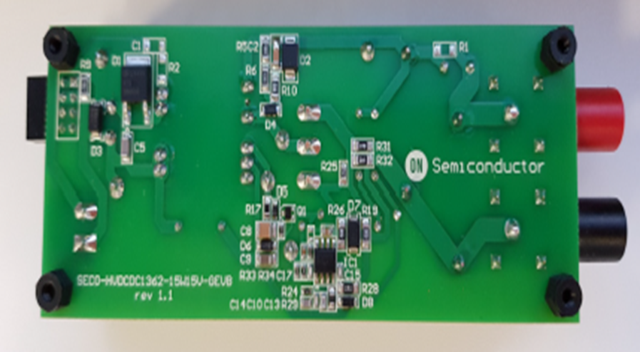 本開發板採用 NCV1362 準諧振峰值電流PSR反激控制器,搭配成本優化的 NVHL160N120SC1(160 mΩ、1200 V)碳化矽MOSFET與FFSP0665B-F085碳化矽二極體。碳化矽MOSFET具備高阻斷電壓與極低閘極電荷(34 nC),大幅降低開關損耗,使電路板在低壓輸入下仍能達到高達86%的效率。