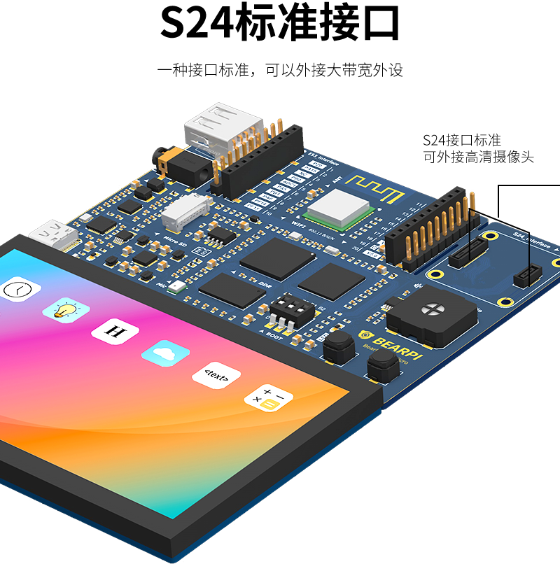 BearPi-HM Micro一如既往的支持IoTCluB E53標準接口,可快速實現物聯網多種案例形態,如智能加濕器、智能檯燈、智能安防、智能煙感等。小熊派聯合IoTCluB新定義 S24接口標準,S24接口可接入HDMI、攝像頭等高帶寬設備,使場景更豐富。