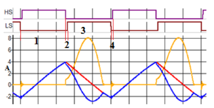 藍色(LC諧振電流) ; 紅色(激磁電流) ; 黃色(次級測電流)