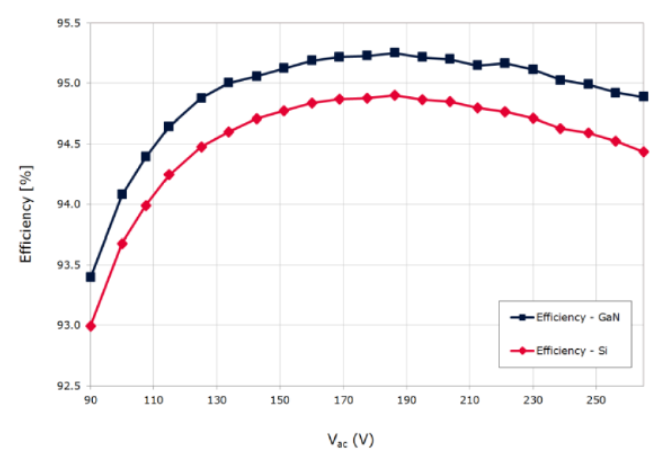 氮化鎵(GaN)是橫向結構的功率元件,其具有小於矽(Si)的十分之一以下的閘極電荷(Qg)與輸出電荷(Qoss),且沒有逆向回復電流(Irr)的問題。因此很適合被設計於高功率密度的電源適配器,並在所有負載範圍操作,都能達到零電壓切換,可有效降低開關的切換損失。