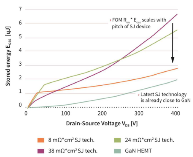 即使氮化鎵元件的輸出電容在低壓時具有較小的值,但是實際儲存在輸出電容的能量值卻相當接近於超接面元件。這個能量在硬切換的每一個週期,會變成熱而散掉,所以氮化鎵的真正價值是在於柔性切換應用,因其具有逆向回復損失(Reverse recovery)為零的特性,以及Qoss比較小之優勢。