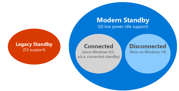 在 Windows 10 中,有兩個電腦的 power 模型:S3 和現代的待命模式。 S3 power 模型是早期標準,並不支援的執行個體上該取用者預期從現代裝置。 現代的待命能夠利用新式的晶片組的所有功能,並可立即整合跨越平板電腦和電腦的範圍。 現代的待命模式的第一個反覆項目已連線的待命,首次推出 Windows 8 和 Windows 8.1 中。 現代的待命進一步延伸了 「 Windows 8.x 連線待命 」 概念,允許在選擇的元件中使用更大的彈性。