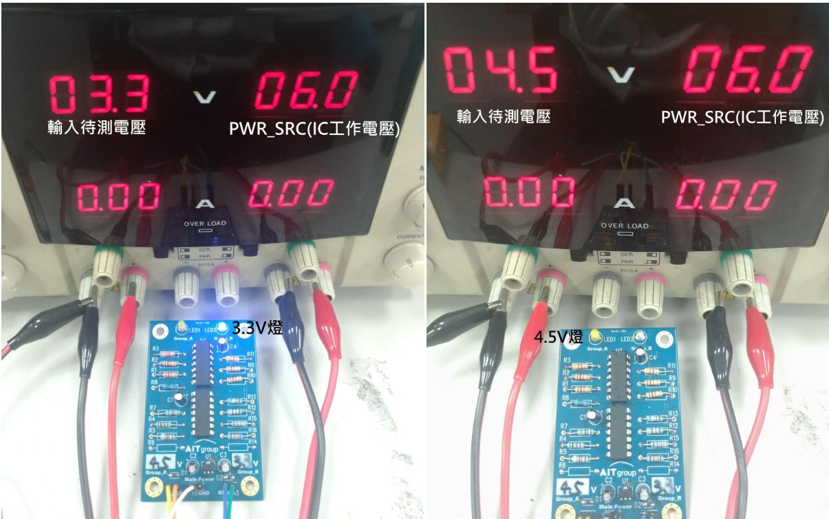 檢測電路中的3.3V和4.5V電壓是否符合設定範圍3.3V : 3.15V ~ 3.45V 內LED亮 ,反之為暗