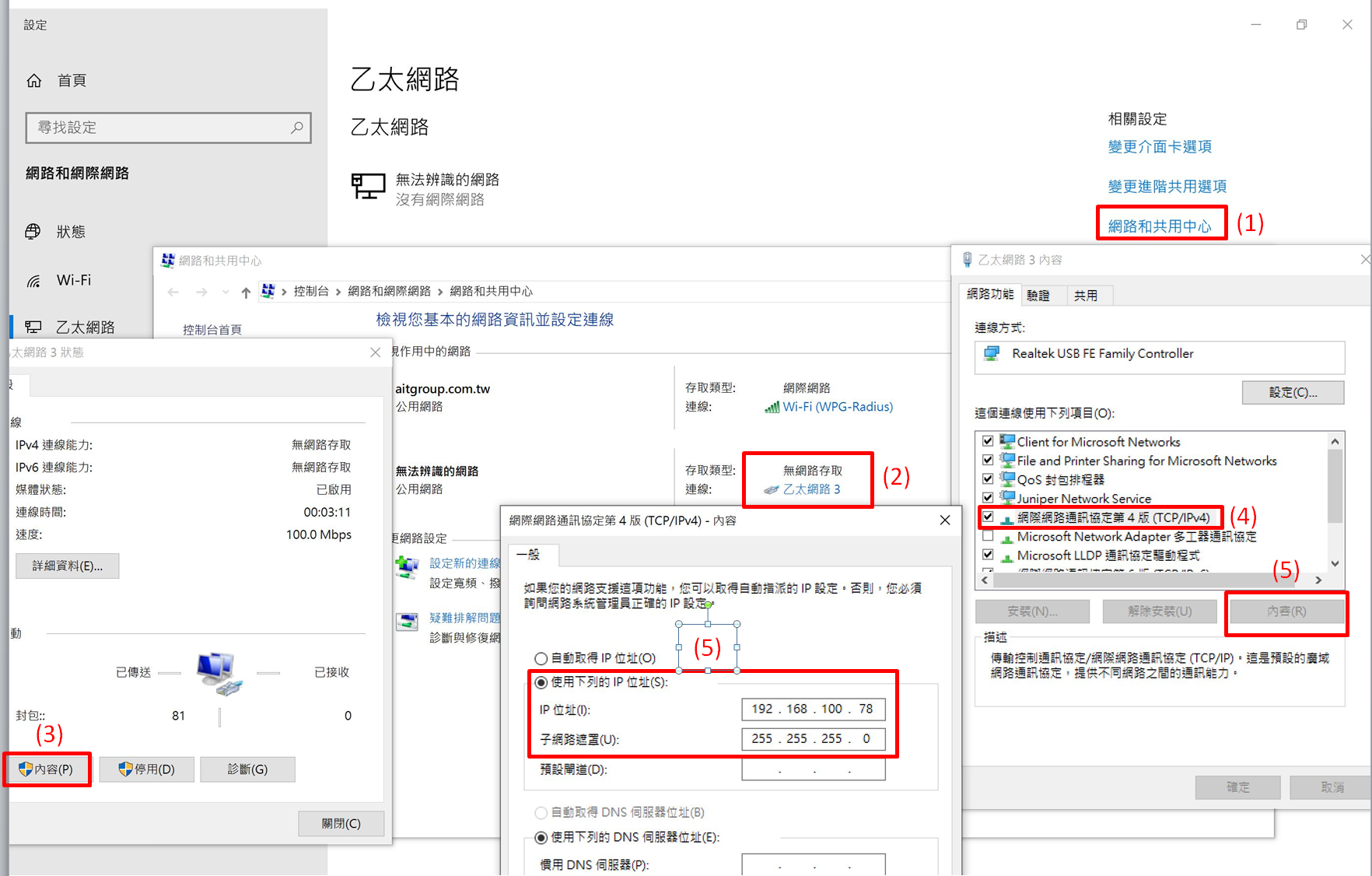 E.網路連接設定修改(底下為Window 10範例),選擇乙太網路修改Ethernet port連線設定(如下步驟及圖示):