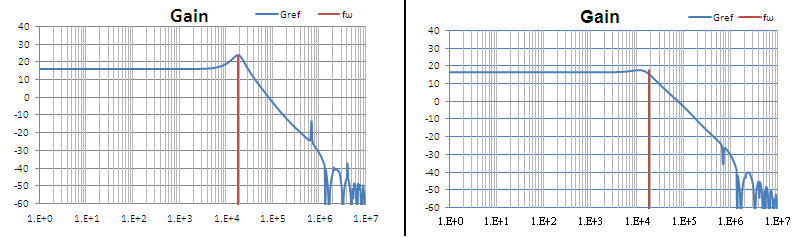 圖九:閉迴路增益沒有加 Cff (左圖) 和加入Cff = 68pf (右圖)