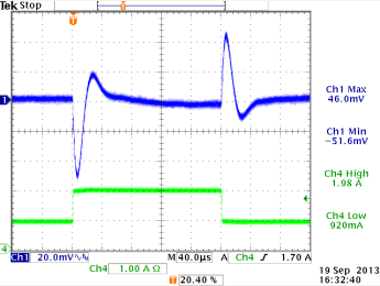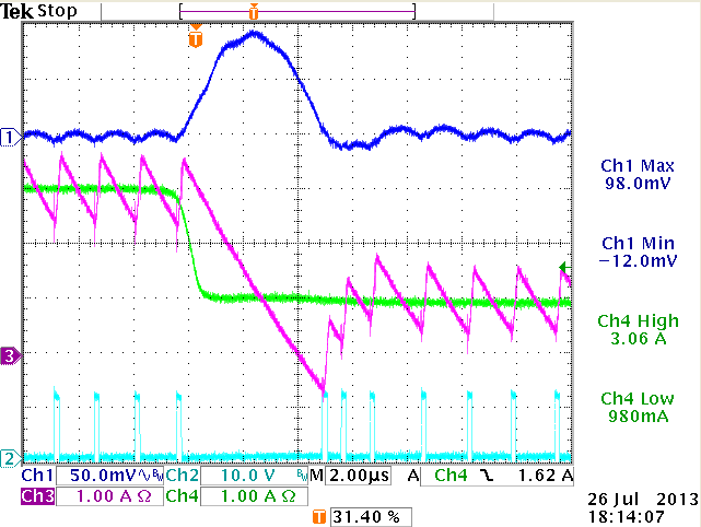 1.2V application large fast step Purple = Inductor current, Green = load current Cyan = SW signal |