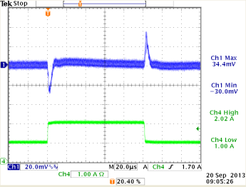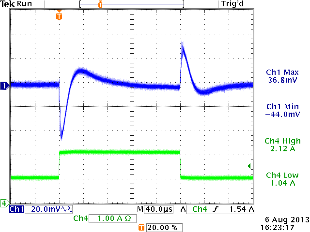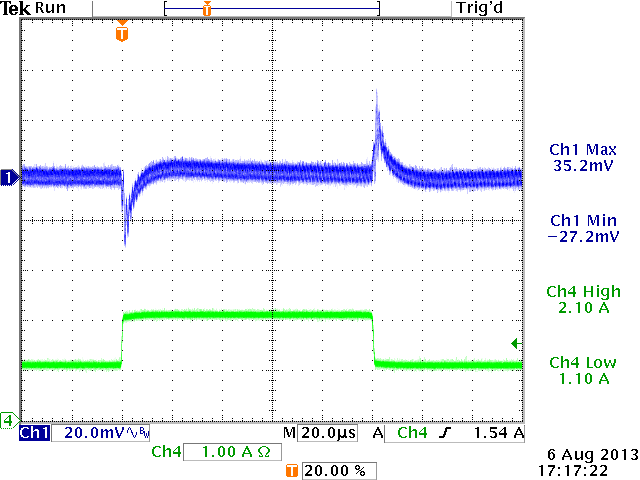 1.2V application with large fast step: Blue = Vout, Green = load current Cyan = SW signal |