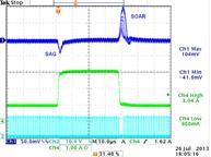 在步階負載變化上升的期間,其輸出電壓將會有欠壓效應 (sag effect),此欠壓 (undershoot) 主要是由直流電源轉換器的反應速度與最大責任週期來決定。