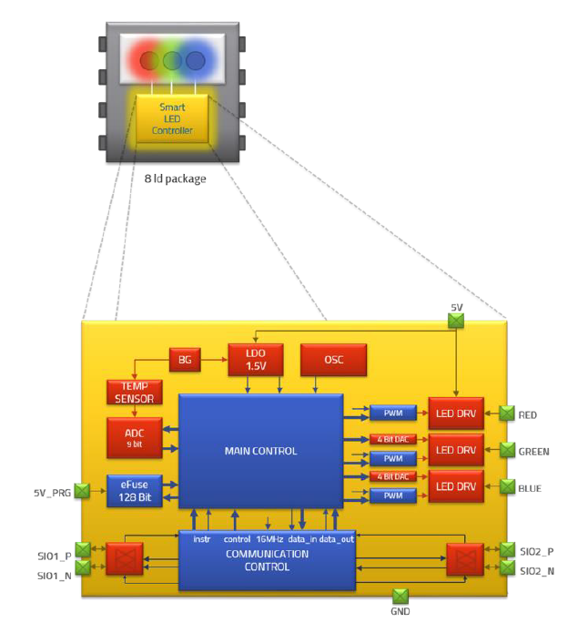 ISELED的基本理念是把原本需要外部處理器處理的參數(例如亮度和顏色穩定性)轉移到RGB LED本身。這意味著,ISELED是一個“數字”器件,因此它可以通過一個協議來尋址,就像任何其他數字器件一樣,只需要讀取表示顏色和亮度的目標參數,大大減輕了外部MCU的工作量,甚至一個8位的MCU就可以完成。ISELED的內部結構如下。