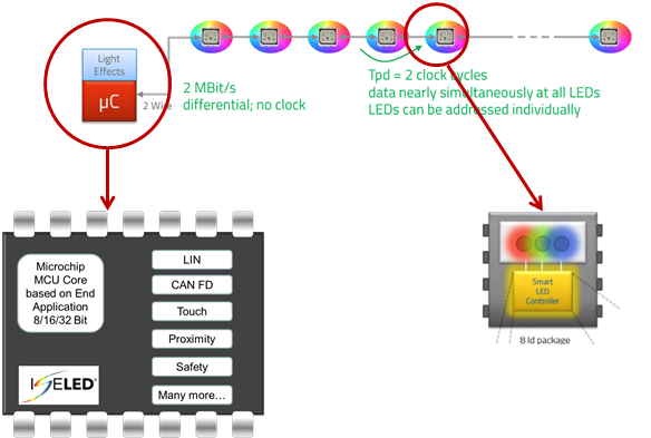 新一代車載照明設備有數百個 LED,通常採用靈活的燈帶形式,每個 LED 包含多個獨立的 RGB LED,需要對每個 RGB LED 進行單獨控制來產生動態效果。燈帶上每個“數字 LED”都包含紅、綠、藍LED,與 ISELED 控制器封裝在一起。“數字 LED”能夠以菊鏈式連接。通過差分總線最多可以連接 4096 個 LED ,可實現 2 Mbps 傳輸速率。這些 LED 可通過一個外部主控制器控制,例如Microchip的PIC18系列MCU。
