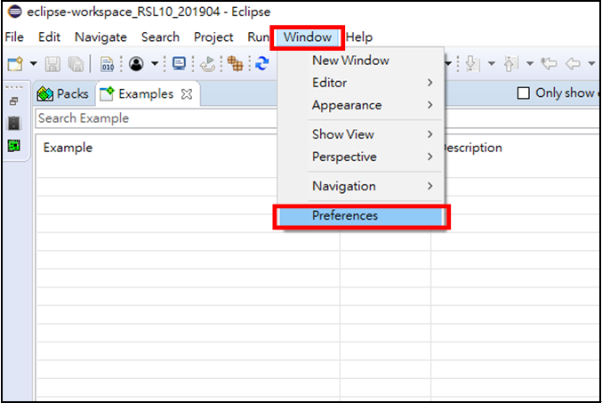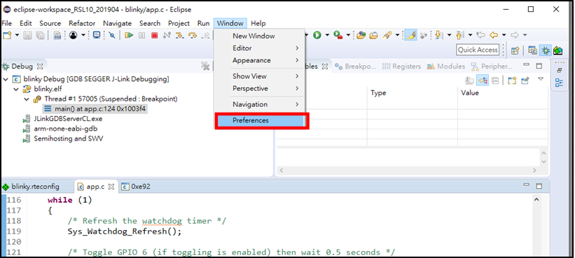 - 在 RSL10 IDE 中點選 Window à Preferences。