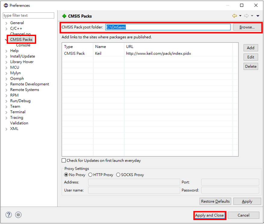 - 在 Preferences 視窗左側中點選 CMSIS Packs ,在 CMSIS Pack root folder 中選擇你要安裝 CMSIS-Packs 的位置,如 C:\OnSemi ,選擇完畢後 點選 Apply and Close。
