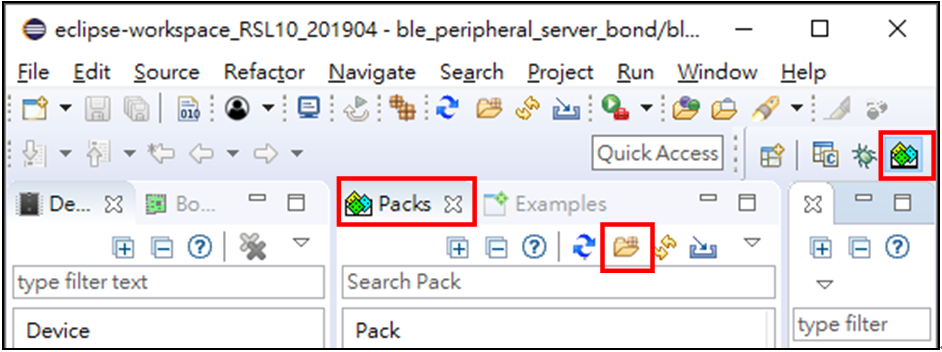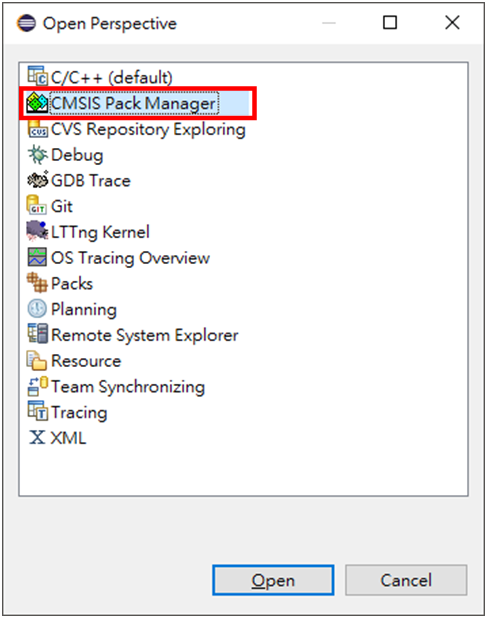- 點選右上角Open Perspective 圖案後點選 CMSIS Pack Manager 。