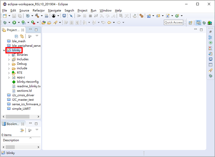 - 回到 C/C++ 視窗,在 Project Explorer 中可看到剛剛載入的 blinky。