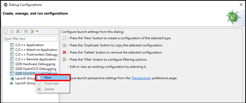 - 在 Debug Configuration 視窗中點選 GDB SEGGER J-Link Debugging 右鍵 --> New。