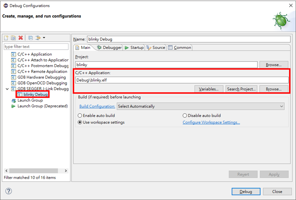 - 確認 Main 分頁中 C/C++ Application 是專案 blinky 所透過 build 產出的 elf 檔案。