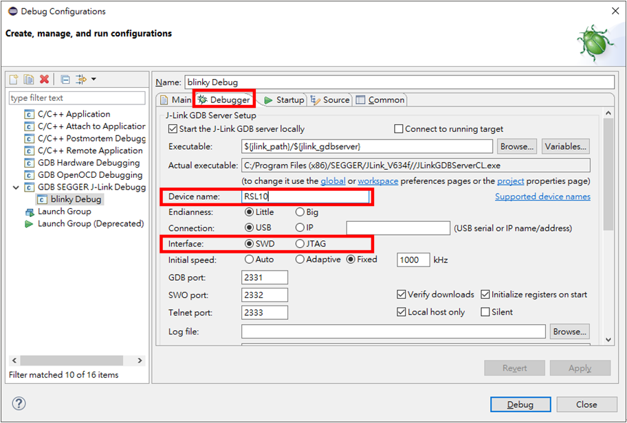 - 切換到 Debugger 在 Device name 欄確認為 RSL10 ,在 Interface 選項中為 SWD ,確認無誤後點選 debug。
