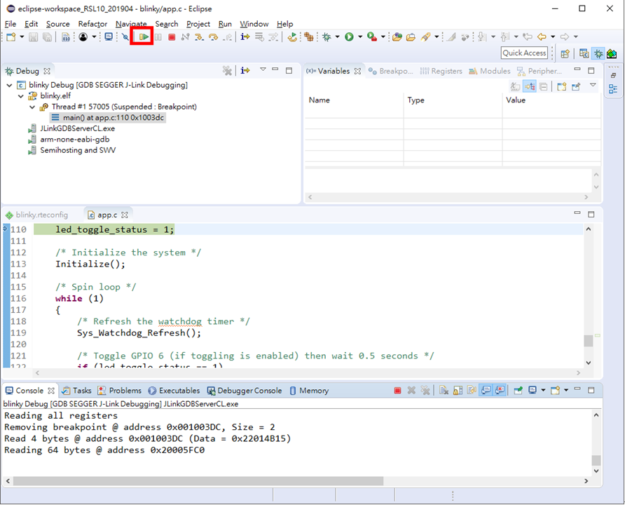 - IDE 會導向 Debugger 模式並暫停在 main 起始位置上 ,點選 Resume 按鈕開始執行 Example project。