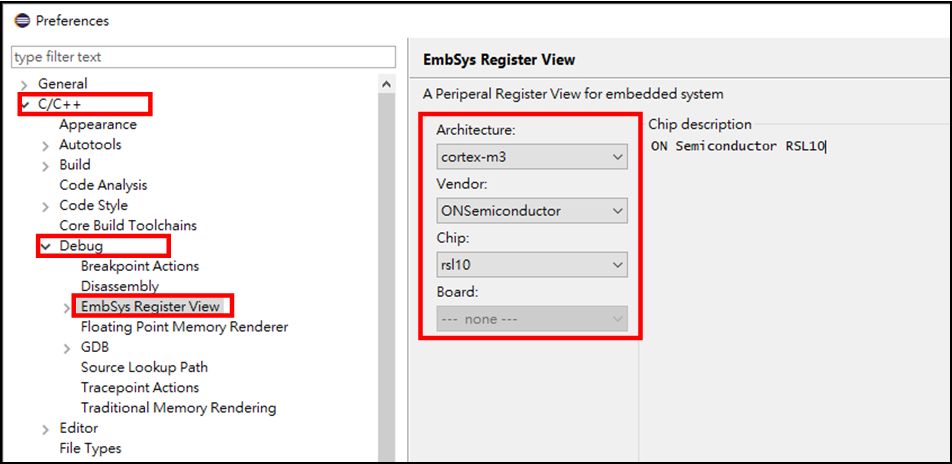 RSL10 IDE 提供 EmbSysReg 插件 ,可供在 Debug 時暫存器清單介面並可透過手動操作暫存器進行 Debug。