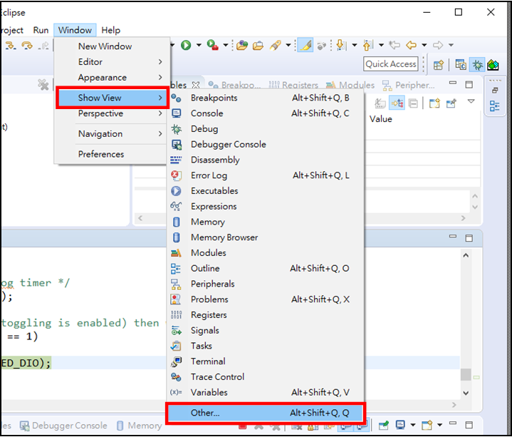 - 在 Debug 視窗下 ,點選 Window --> Show View -->Other...