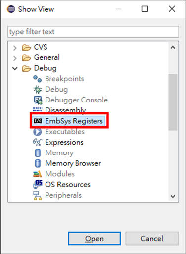 - 在 Debug 底下 ,點選 EmbSys Registers 後點選 Open。