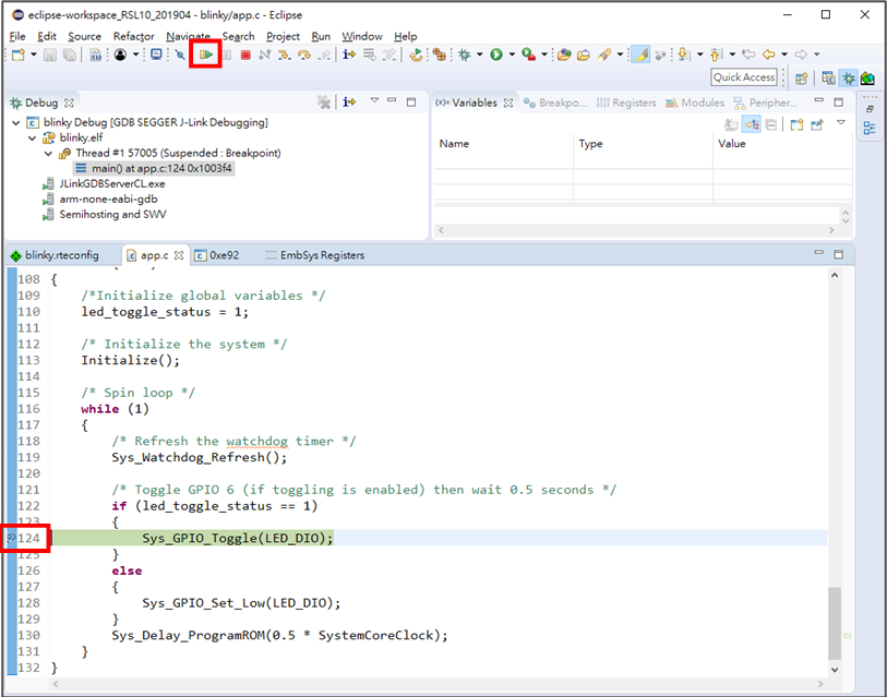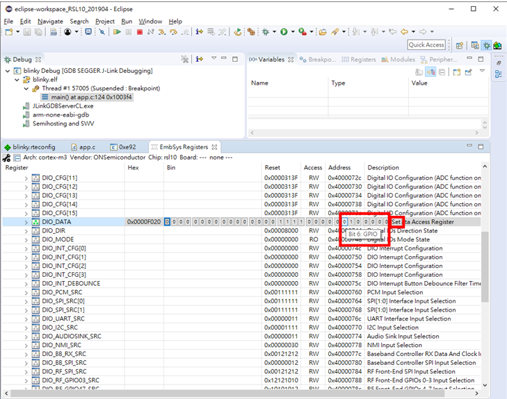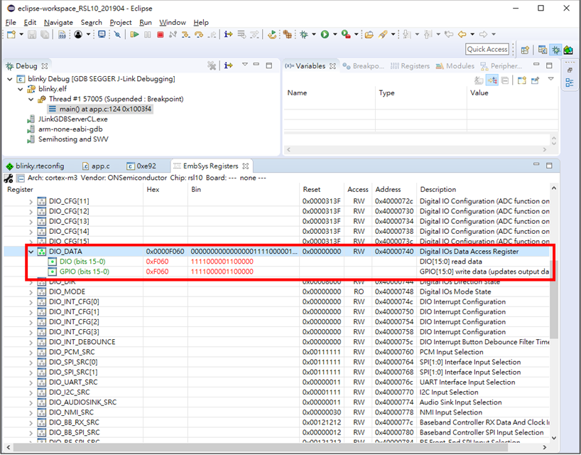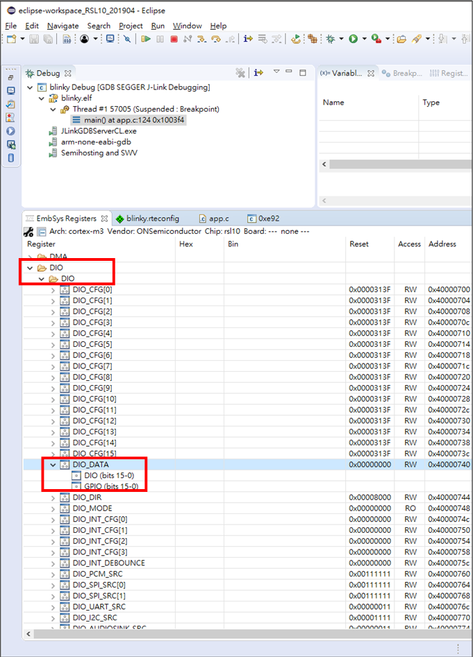 - 在程式中第 124 行插入中斷點後 ,點選 Resume ,當程式再度停在中斷點時即可發現當執行後 DIO_DATA 有變化。