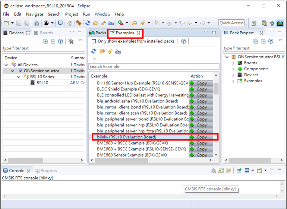 - 在 CMSIS-Packs Manager 中點選 Examples 分頁 ,根據安裝的 CMSIS-Pack ,此分頁提供 Example project ,使用者可根據自己需求載入 example ,在此步驟點選 blinky ,點選 copy 後即載入至 IDE 中。