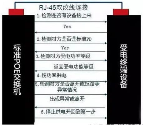 內部有POE控制晶片。它在供電之前有一個檢測的功能,當設備連接好之後,POE交換機會向網路中發送一個信號,檢測網路中的IP終端是否有支持POE的受電設備,如果支持,POE交換機才會給它供電,如果不支持POE,交換機就不會給它供電,這對IP終端有一個保護的作用。