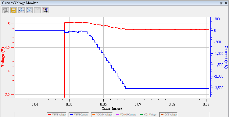 只宣告電壓的情況下,當抽載電流超過供電端能負載的能力範圍,則這時合理設計是讓電壓進入CC LOOP。也就是說電流可以繼續往上拉載,可是隨著電流往上,電壓會隨著往下掉,這樣輸出總功率則維持不變。