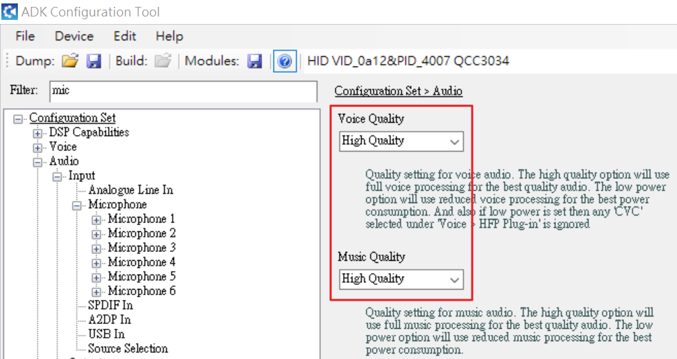 2. 在ADK Configuration Tool裡面設定Voice Quality和Music Quality為High Quality