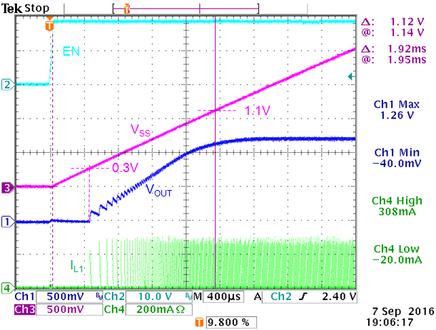 ,其中的CSS是軟起動電容的值,Iss是軟起動電流(典型值為6µA)。VOUT從VSS上升到0.3V時開始隨其上升而上升,VSS的終點是1.1V。
