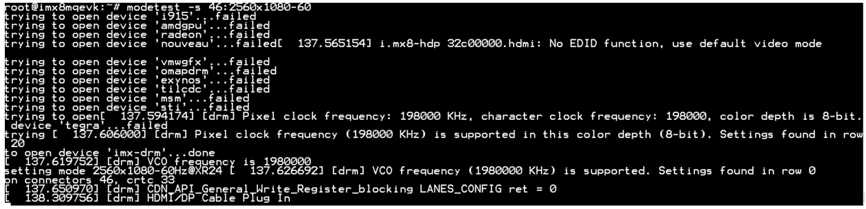 #modetest -s 46:2560x1080-60 (此解析度必須有定義在上述edid_cea_modes中,否則不會成功)
