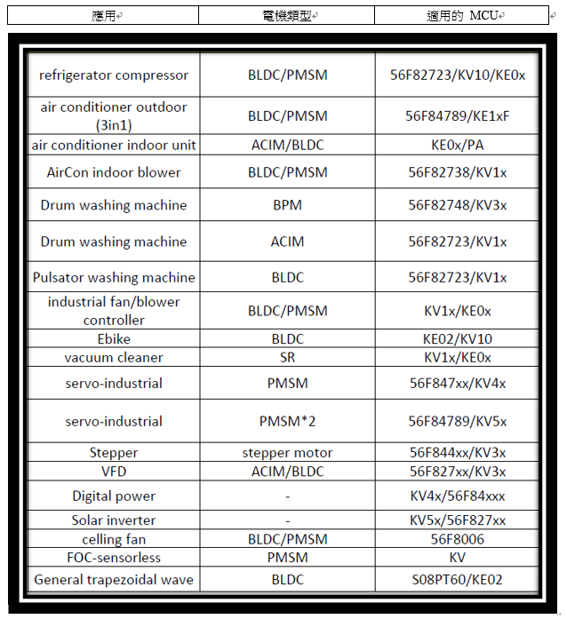 - KV3x將支持BLDC和PMSM傳感器或無傳感器FOC應用,並為PMSM和無傳感器ACIM電機提供高動態支持。