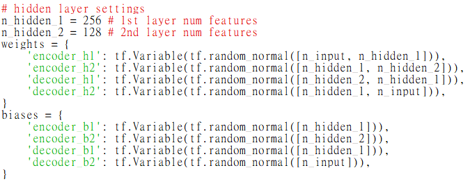 在對比環節:比較原始數據與還原後的擁有 784 Features 的數據進行 cost 的對比,根據 cost 來提升我的 Autoencoder 的準確率,下圖是兩個隱藏層的 weights 和 biases 的定義: