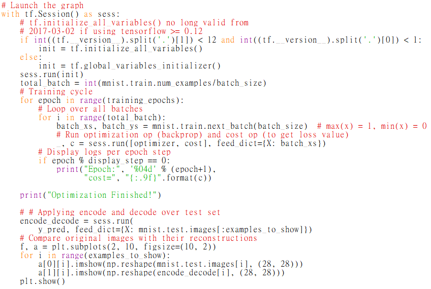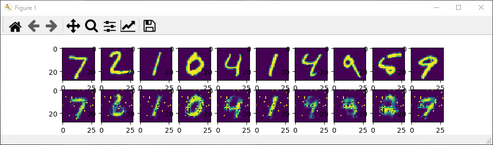 最後,通過 Matplotlib 的 pyplot 模塊將結果顯示出來, 注意在輸出時MNIST數據集經過壓縮之後 x 的最大值是1,而非255: