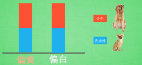 比如對比金毛和吉娃娃,它們有很多特徵可以對比,比如眼睛的顏色、毛色、體重、身高等,為了簡化我們的問題,我們主要觀察毛色和身高這兩個特徵,而且我們假設這兩種狗毛色僅為偏黃色或偏白色。接著我們來對比毛色,結果發現金毛和吉娃娃兩種顏色的比例各佔一半。