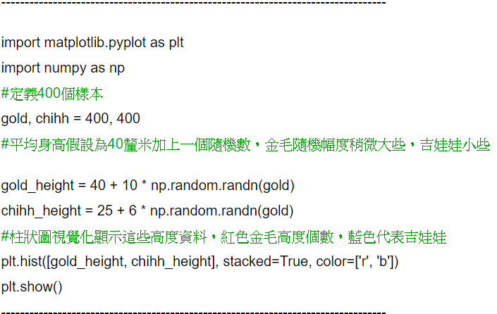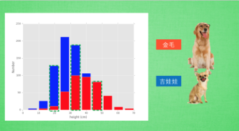 如下圖所示,高度為50的紅色這組資料中,基本上判斷這隻狗就是金毛,同樣高度大於50的也是金毛;而當資料為20時,我們能夠說它很可能就是吉娃娃;而高度為30的範圍,我們很難判斷它是金毛還是吉娃娃,因為兩種狗都存在而且數量差別不大。所以,雖然高度是一個非常有用的特徵,但並不完美,這就需要我們引入更多的特徵來判斷機器學習中的問題。