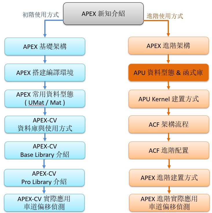 前文回顧,從上一篇 APEX 進階架構 ,介紹關於進階的 APEX 硬體架構與軟體建置流程。亦從上一篇的觀念得知,建立 APEX Kernel 是需要層層建立起來的,第一層就是建置 APU Kernel 。而此篇文章將以工具書的概念,快速地介紹設計 APU Kernel 時會運用到的資料型態以及函式庫。以利於後續在撰寫 APU Kernel 時,能即時找到相應的使用方式,如同下圖 “APEX 技術指南-文章架構示意圖” 所示,此次介紹章節為 “ APU 資料型態 & 函式庫 “ 。