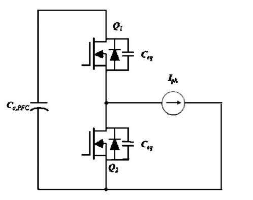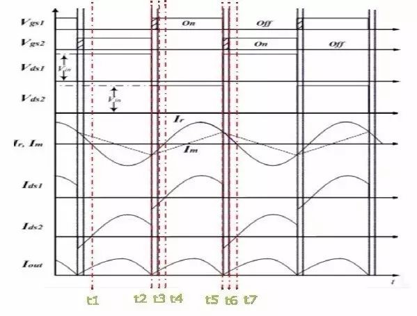 Q1,Q2同時關斷, D1,D2關斷, 原邊電流I(Lr+Lm)給Q1的Coss充電, 給Coss2放電, 直到Q2的Coss電壓為零。 此時Q2二極體開始導通。 Q2導通時相位結束。