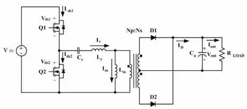 圖1.1和圖1.2分別給出了LLC諧振變換器的典型線路和工作波形。如圖1所示LLC轉換器包括兩個功率MOSFET(Q1和Q2),其占空比都為0.5;諧振電容Cr,副邊匝數相等的中心抽頭變壓器Tr,等效電感Lr,勵磁電感Lm,全波整流二極體D1和D2以及輸出電容Co。