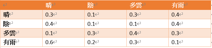 左側的縱坐標表示第一天的天氣狀況,上方的橫坐標表示第二天的天氣狀況。經過長期的統計,得到了這樣一個天氣轉移機率表。其中,第3 行第5 列表示在第一天是陰天的情況下第二天有雨的機率。
