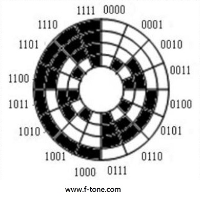 下圖是二進位的編碼盤,圖中空白或透明的部分是用「0」來表示;黑色的部分是用「1」來表示。通常將最高位元為最外側,最低位元以最內側表示,因此就可形成四位的二進制碼,如0000、0001…1111。當轉動到不特定的角度位置時,光源打到編碼盤所透射入光感應器的遮蔽現象,從而輸出高低電位獲得轉盤相對位置訊息。