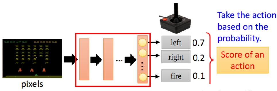 Policy Gradient不通過誤差反向傳播,它通過觀測信息選出一個行為直接進行反向傳播,當然出人意料的是他並沒有誤差,而是利用reward獎勵直接對選擇行為的可能性進行增強和減弱,好的行為會被增加下一次被選中的機率,不好的行為會被減弱下次被選中的機率。舉例如下圖所示:輸入當前的狀態,輸出action的概率分佈,選擇機率最大的一個action作為要執行的操作。