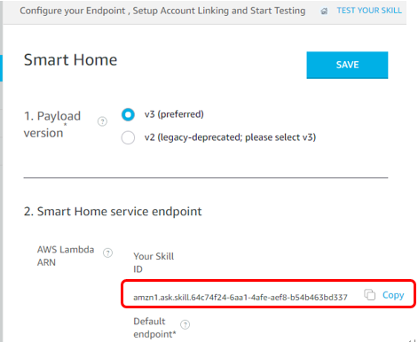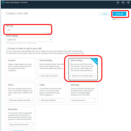 1. 輸入Skill nameà選擇Smart Home Skill APIà點選Create skill(21)
